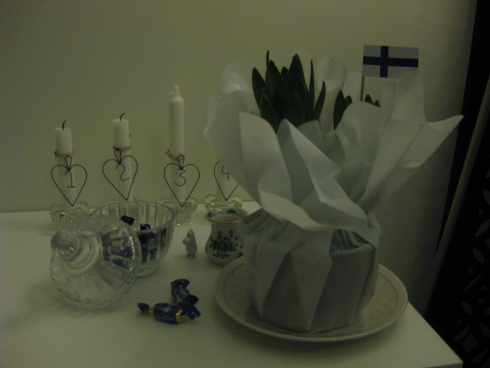 Ystävien jouluterveydykset pakkasin ruskeasta paperista tehtyihin pusseihin, jotka koristelin ajamaan myös joulukortin virkaa. Sinne pääsivät myös virkatut sydämet, joita pitkin syksyä väsäilin. Tällaiset pikku pussit veimme myös päiväkodin hoitajille. Niissä oli joulutervehdyksinä omaväsäämät lumihiutaleheijastimet.